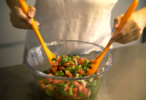 • In a big bowl, mix the beans, tomatoes, onion, bell pepper, cucumber, parsley, and cilantro.