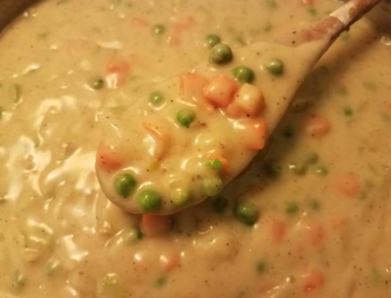 Stir in the flour to coat the veggies and cook for another minute. Slowly whisk in the chicken broth and milk. Bring to a simmer and let the mixture thicken, stirring frequently. Add chicken, peas, and herbs (if using). Season with salt and pepper. Remove from heat.