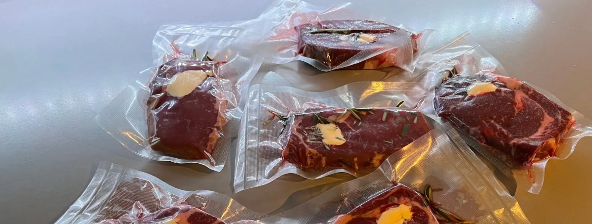 2. Place each steak in a vacuum-seal or zipper-lock bag with 1 tbsp butter, 1 garlic clove, and 1 herb sprig.