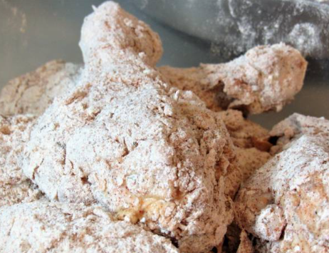 Dredge the Chicken: Remove chicken from marinade, letting the excess drip off. Dredge in the seasoned flour mixture, pressing firmly so it sticks well.