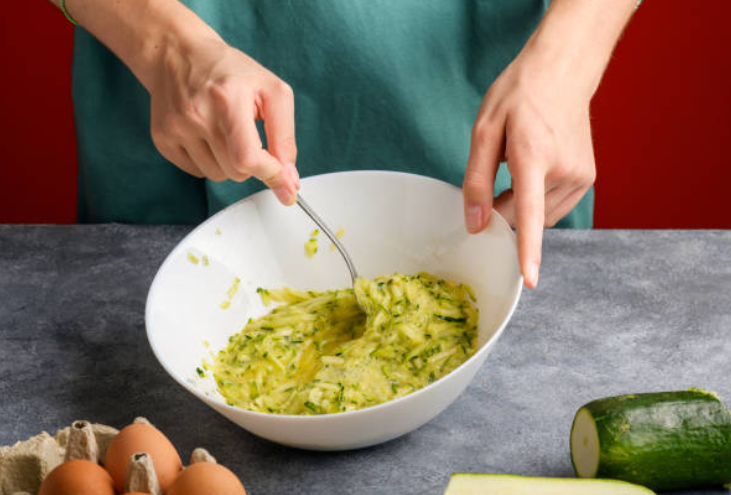 Prep the Zucchini: Grate the zucchini and place it in a colander. Toss with salt and let sit for 10–15 minutes to draw out moisture. Then, squeeze out as much liquid as possible using a clean kitchen towel or cheesecloth.