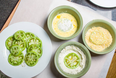 Bread the Tomatoes: Dredge each tomato slice in flour, then dip in the egg mixture, and finally coat with the breadcrumb-cornmeal mix. Press lightly to adhere.