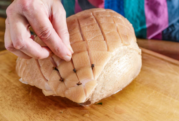 Preheat your oven to 325°F (163°C). Place the ham cut-side down on a rack in a roasting pan. Score the surface of the ham in a diamond pattern, about ½ inch deep. If desired, insert whole cloves into the intersections.
