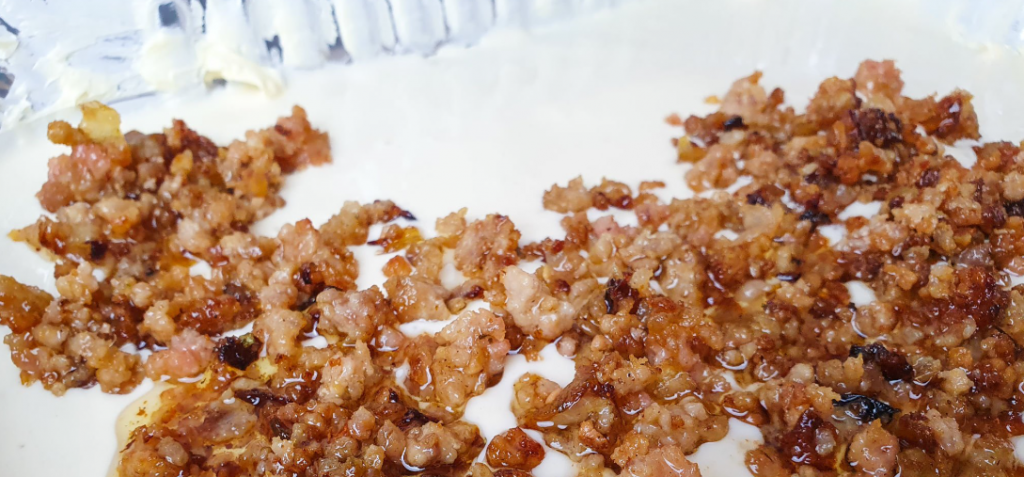 In a skillet over medium heat, cook the sausage until browned and fully cooked, breaking it into crumbles. Drain excess fat and set aside to cool slightly.
