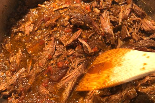 Remove beef and shred with two forks. Discard bay leaves. If desired, return the shredded beef to the pot to soak in the consomé (broth).